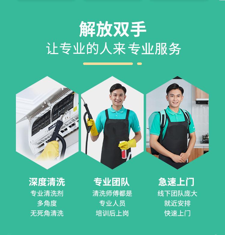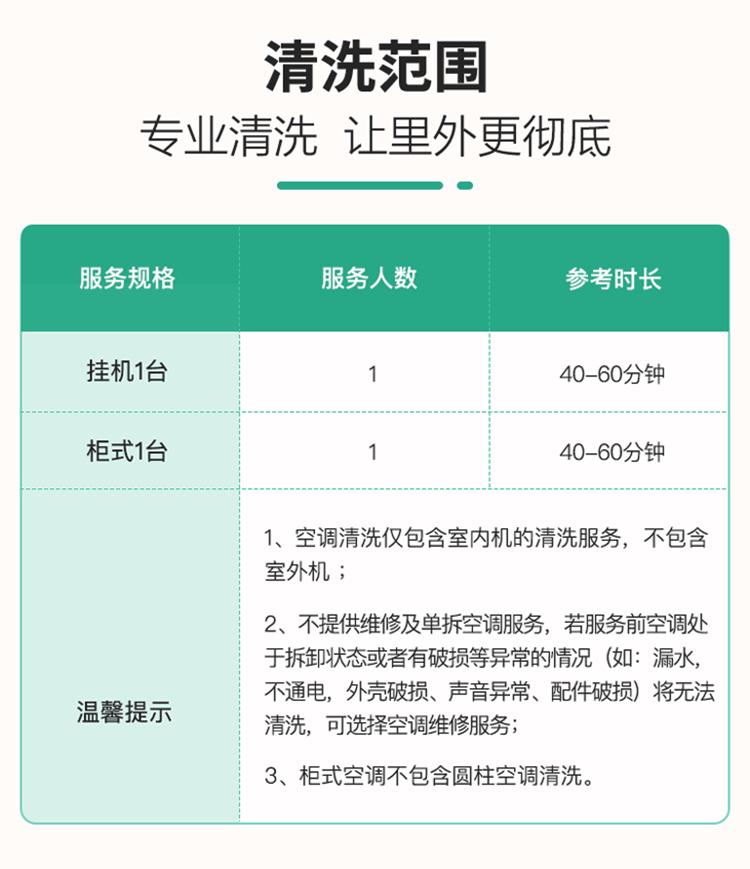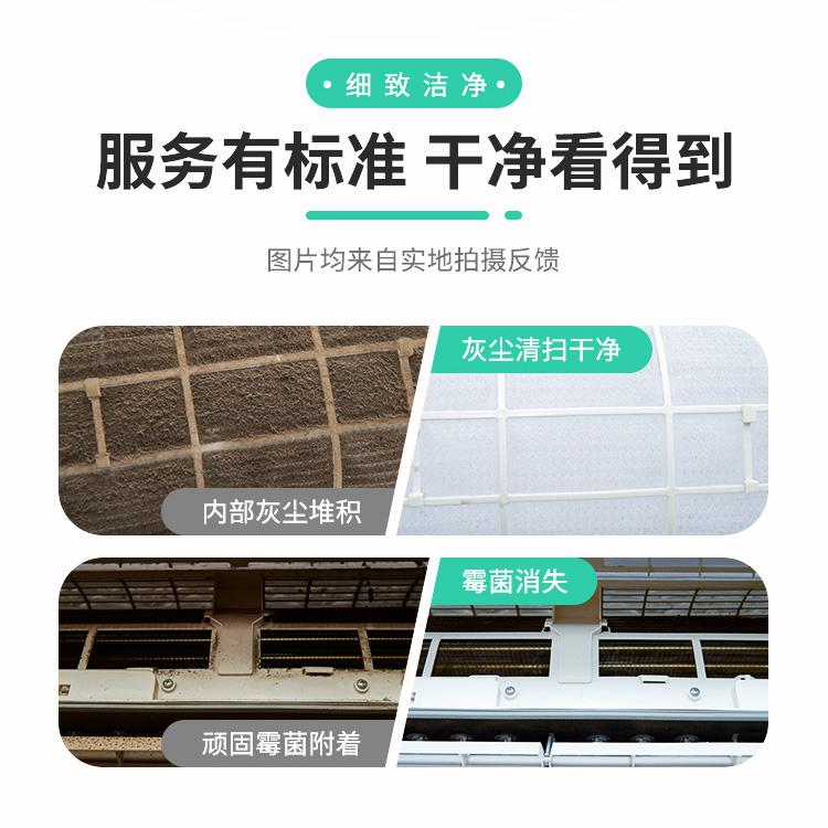 服务内容: 1. 检测空调是否能够正常运行; 2. 断电,整理周边环境; 3. 使用专业清洗剂,高压清洗导风条、面板、面框、蒸发器、过滤网、风轮、风道、外观等; 4. 清除空调内部灰尘、胺、碱、细菌及病毒; 5. 装机还原,对空调外部进行保养; 6. 测试空调出风量、有无异味等; 服务保障: 1. 省心一口价:不现场加价,无额外收费; 2. 质保返修:服务完成后30天内,清洗处出现非人为原因造成的故障,可联系商家免费返修解决。 3,18点30分到20点的订单都要收取晚间加班费10元一单, 20点后的订单收取晚间加班费20元一单.。